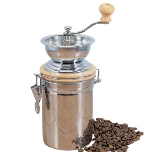 Manual coffee grinder with clip canister.Adjusts for coarseness of grounds.stainless steel with silicone seal.8 inch / 20.5cm High..
